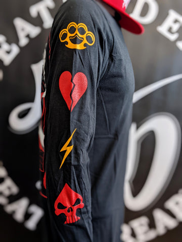 Photos are of the old long sleeve version. Now printed on crewneck sweaters. Recommend going a size up from usual.